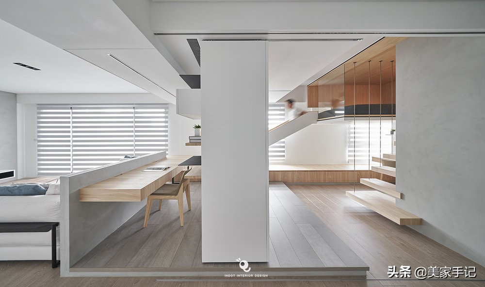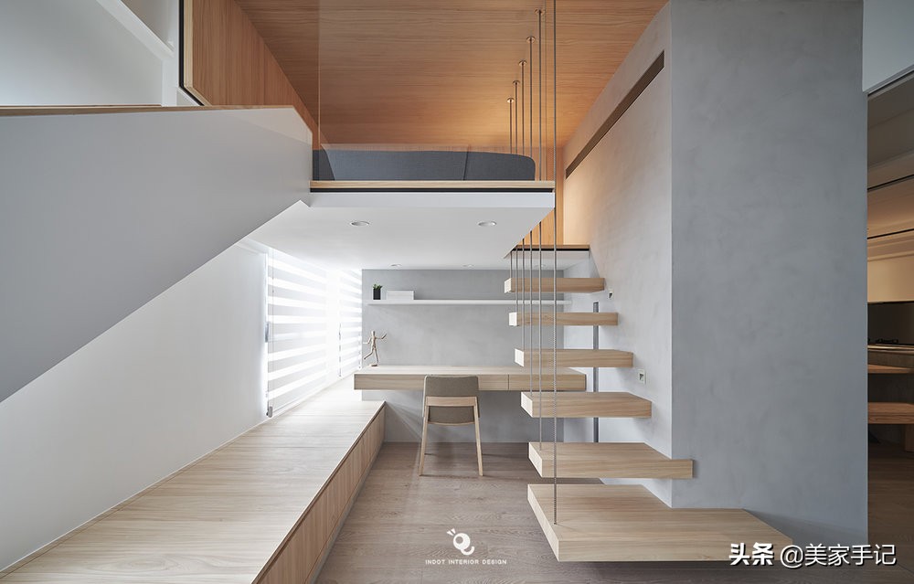 除了这些,业主可谓将“悬空术”发挥到了极致,除了之前提到过的电视柜以及卧室床,还有就是悬空结构的楼梯以及对面的书桌等等,这些不仅可以让整个空间显得通透灵活,而且看着非常漂亮。